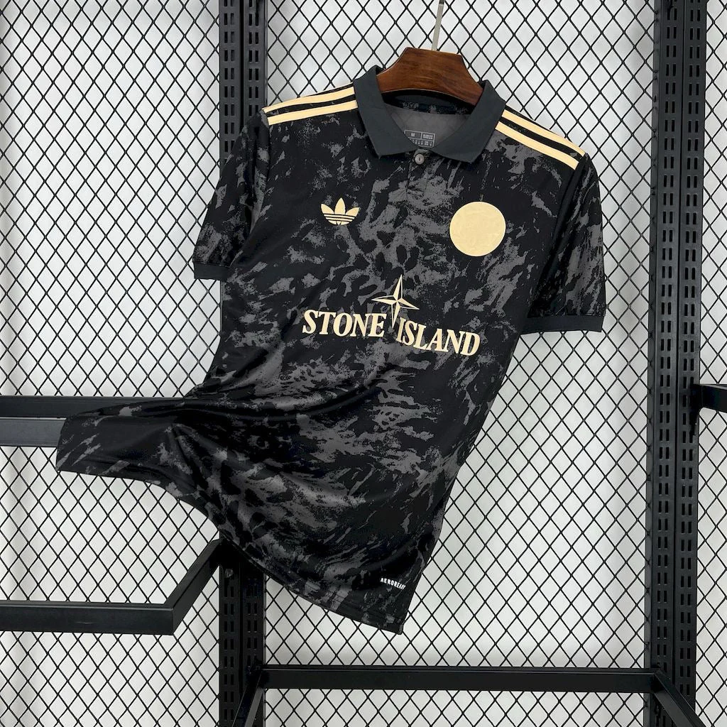 Ce maillot arbore une base noire sophistiquée, agrémentée de détails dorés et gris, offrant une esthétique moderne et minimaliste. Le logo Stone est fièrement affiché sur la manche, ajoutant une touche exclusive à cette pièce de collection.