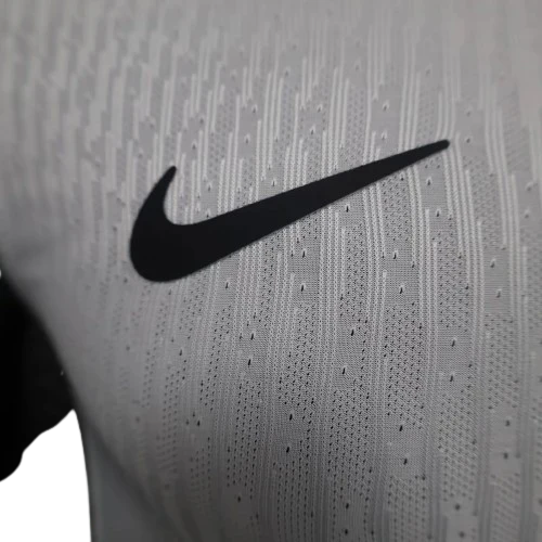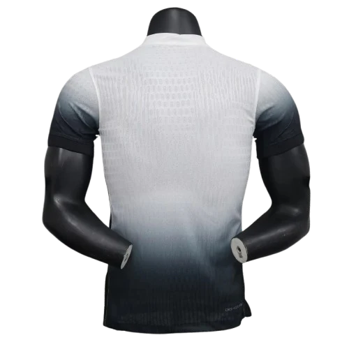 Le maillot présente une couleur blanche éclatante, avec un dégradé noir subtil qui s’étend du bas du maillot jusqu’aux manches, ajoutant un effet moderne et dynamique. Cette fusion de couleurs rappelle l’élégance et l’audace du club, tout en restant fidèle à son identité historique.
