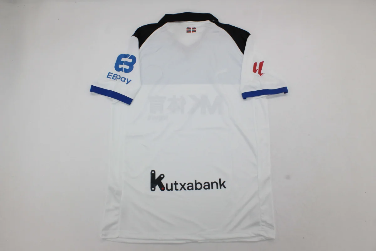 Le logo brodé du Deportivo Alavés est mis en valeur sur la poitrine, accompagné de sponsors discrets mais visibles. Le col noir et les manches contrastées apportent une touche d’originalité tout en conservant l’élégance du maillot.