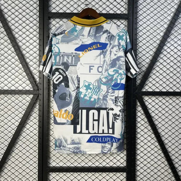 Ce maillot présente une base blanche rehaussée de collages graphiques en noir, bleu et jaune, avec des références iconiques telles que Messi, Ronaldinho et le blason du Barça. Fabriqué en tissu léger et respirant, il assure un confort optimal pendant l’effort.