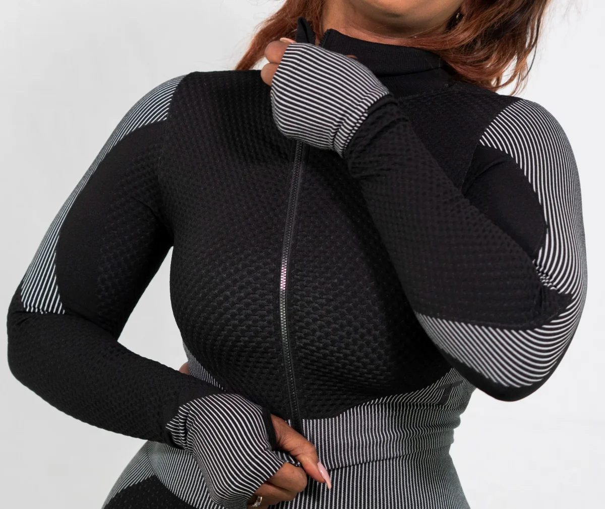 Haut court à manche longue Black-Gray TchimoTean sans couture. Grâce à sa technologie anti-transpiration, son tissus résistant aux squats et aux marques d’amélioration de la forme, ce haut TT est conçu pour vous aider à soutenir votre entrainement et vous donner un ajustement comme jamais auparavant. Tous nos Hauts tailles normalement. Notre model fait 1,64m et porte une taille M