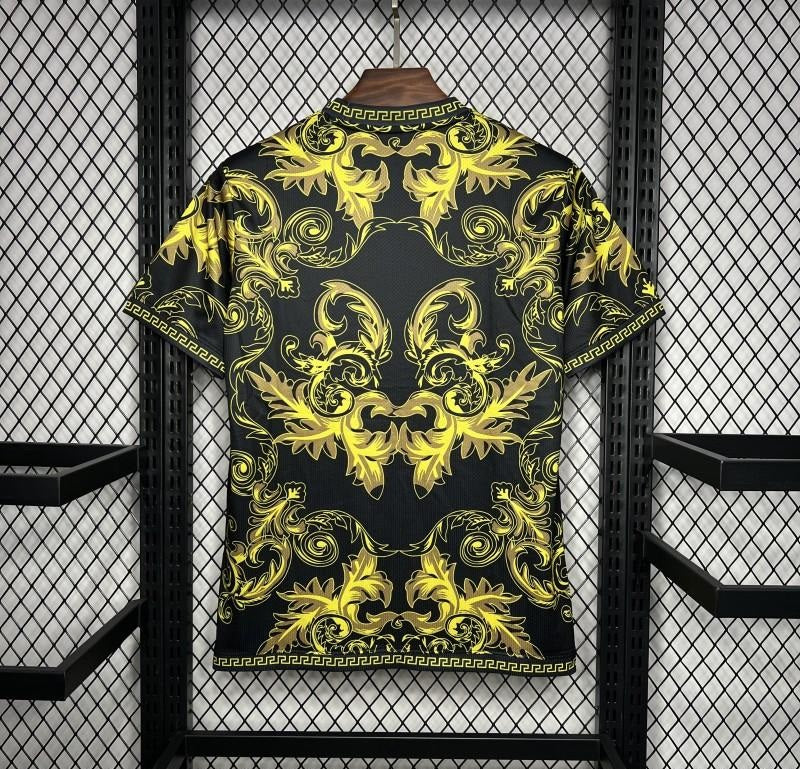- Design : Logo de l’équipe brodé, éléments Versace imprimés, coupe ajustée et motifs inspirés de la haute couture