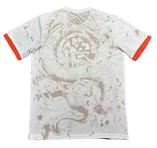 Ce maillot arbore une base blanche éclatante, symbolisant l’aura lumineuse et pure d’un Super Saiyan, accompagnée de détails dorés qui rappellent les cheveux dorés iconiques de Goku lorsqu’il atteint son niveau légendaire.