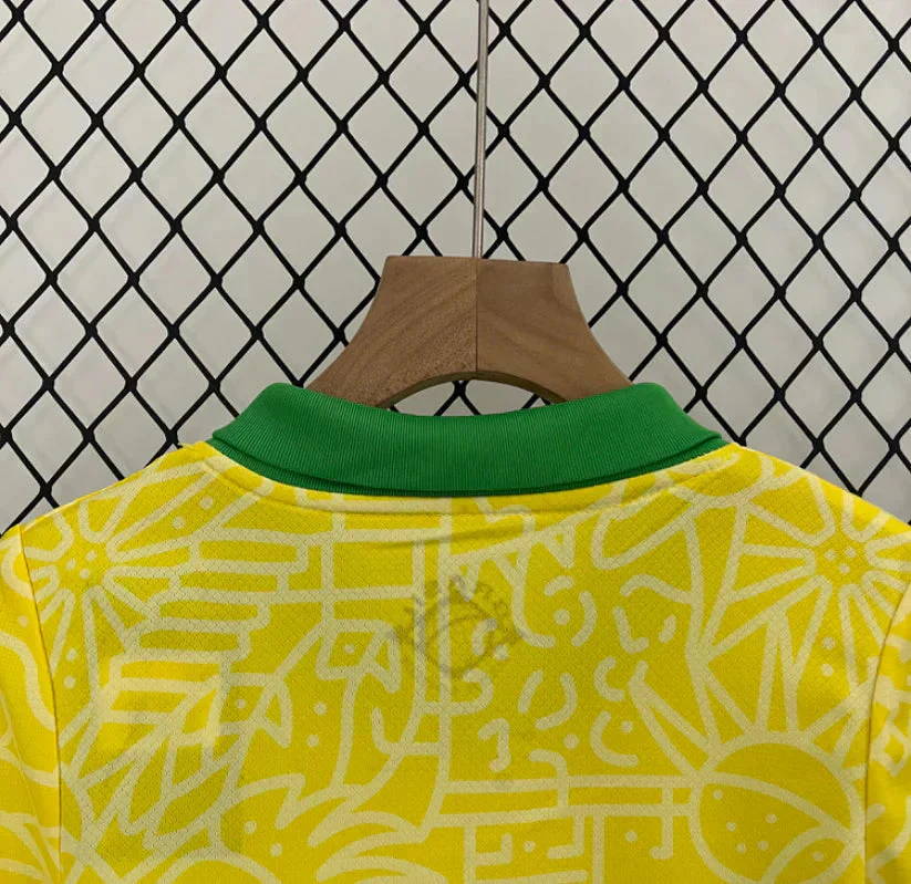 Le design du kit domicile est inspiré des grandes stars du football brésilien avec une base jaune éclatante et des détails subtilement bleu et vert. Ce kit offre un équilibre parfait entre tradition et innovation, idéal pour les petits joueurs passionnés.