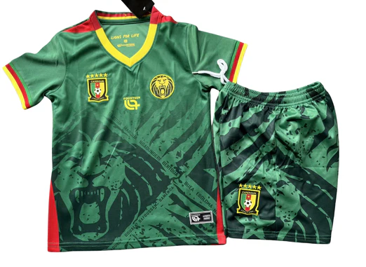 Le Kit Enfant Cameroun Domicile 2025 est l’ensemble idéal pour les jeunes supporters des Lions Indomptables. Conçu avec soin et passion, ce kit permet aux enfants d’afficher leur amour pour l’équipe nationale avec style et confort.