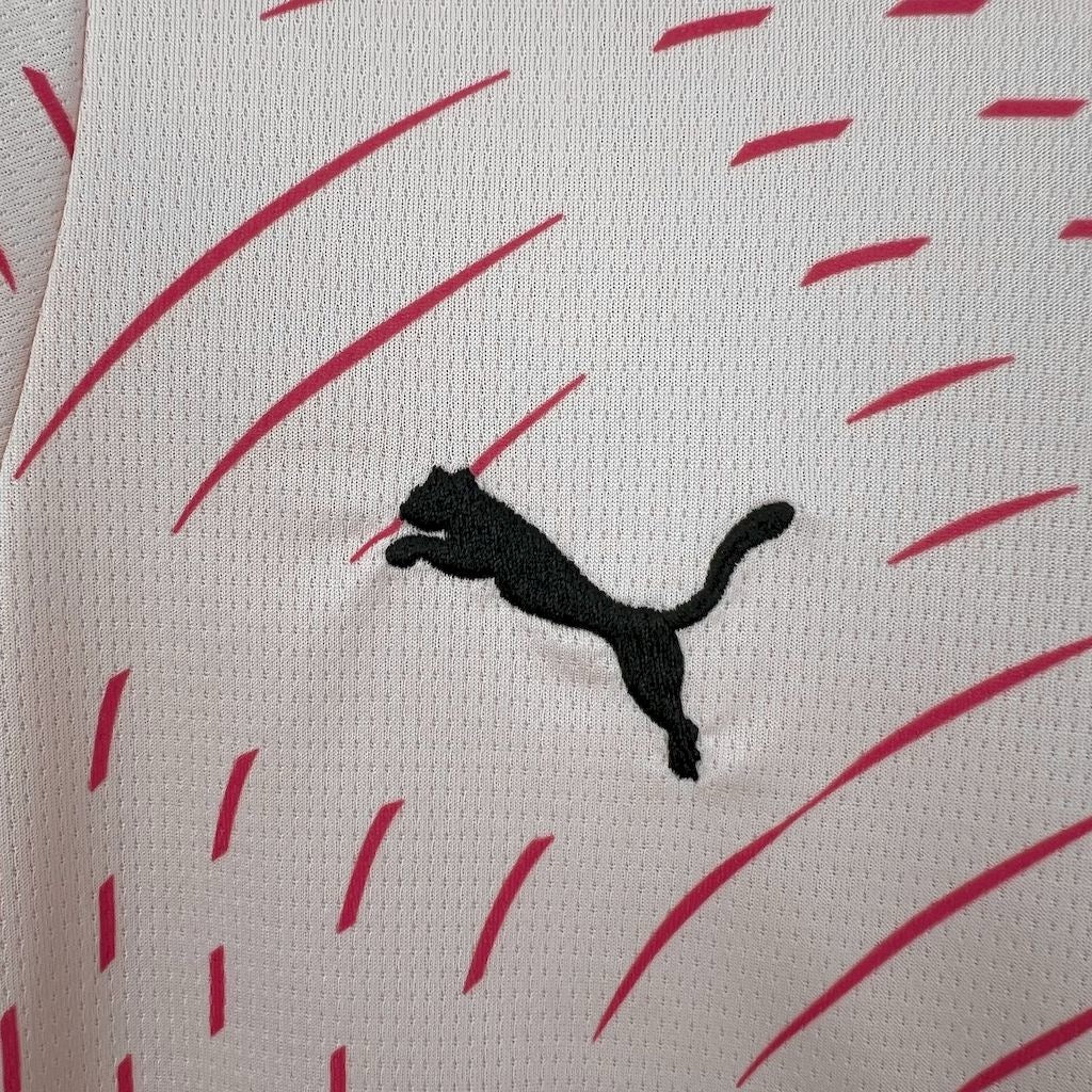 Le troisième maillot se distingue par son noir élégant, rehaussé de détails rouges et blancs pour un contraste saisissant. Son design moderne intègre des graphismes subtils qui ajoutent du caractère tout en restant fidèle à l’identité du club.