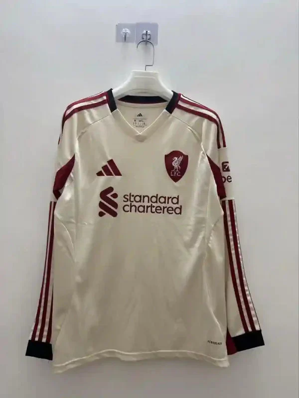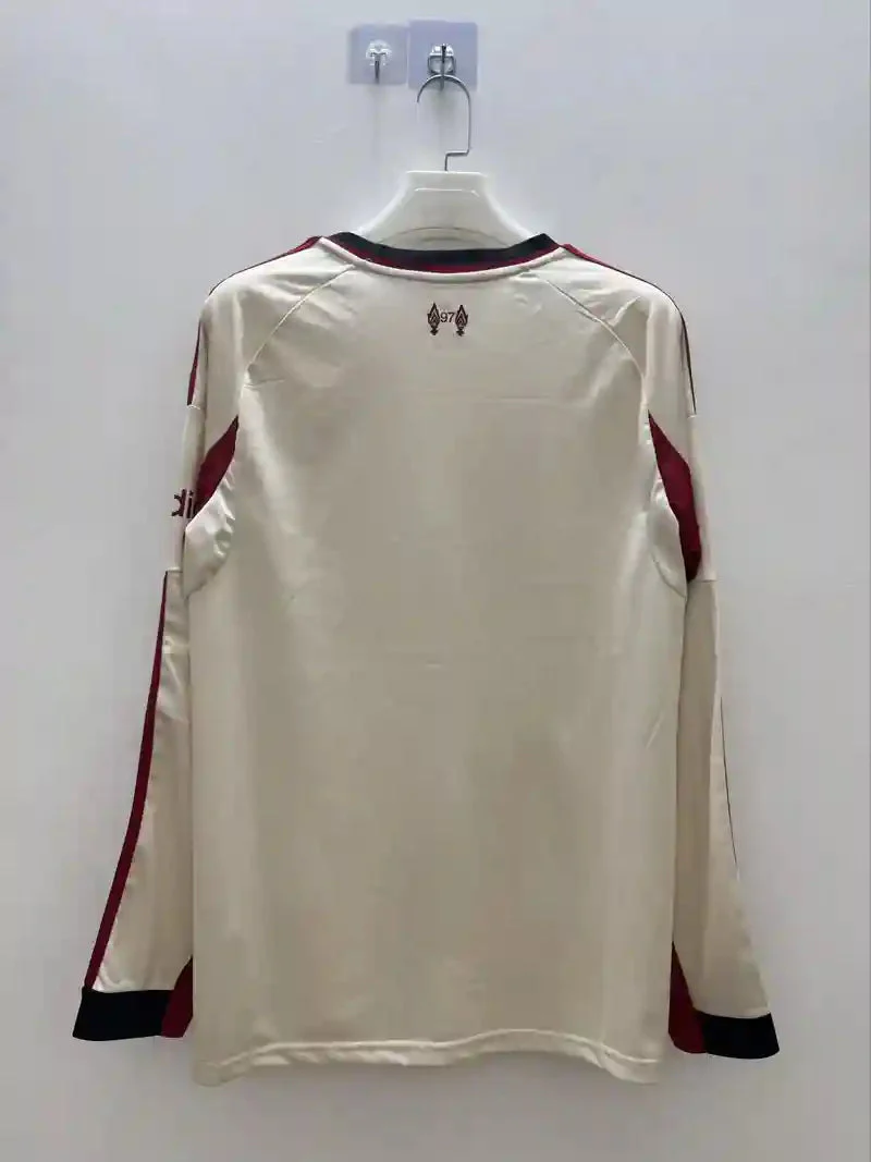 Ce maillot se distingue par une teinte beige raffinée, mise en valeur par des détails bordeaux qui rappellent l’héritage emblématique de Liverpool. Fabriqué en matière respirante, il assure une gestion optimale de la transpiration, garantissant confort et fraîcheur même lors des matchs les plus intenses.