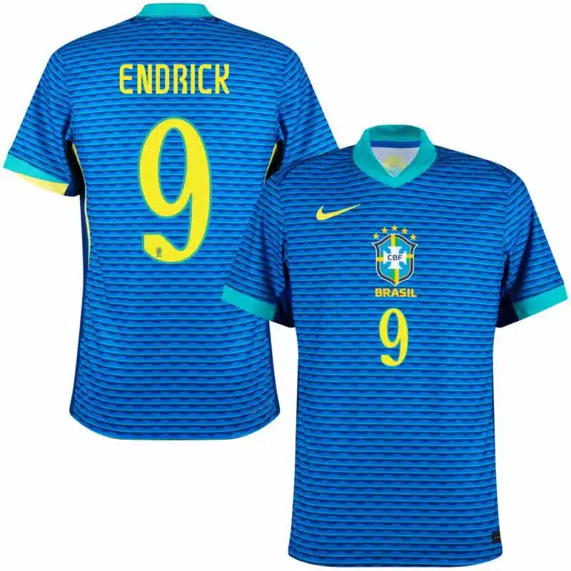 MAILLOT BRÉSIL ENDRICK EXTERIEUR BLEU 2024/2025 Supporte le Bresil fièrement avec ce maillot extérieur Endrick Montre ta passion et ton esprit d’équipe à chaque match. Personnalisez votre maillot avec le nom et le numéro de vos joueurs préférés !