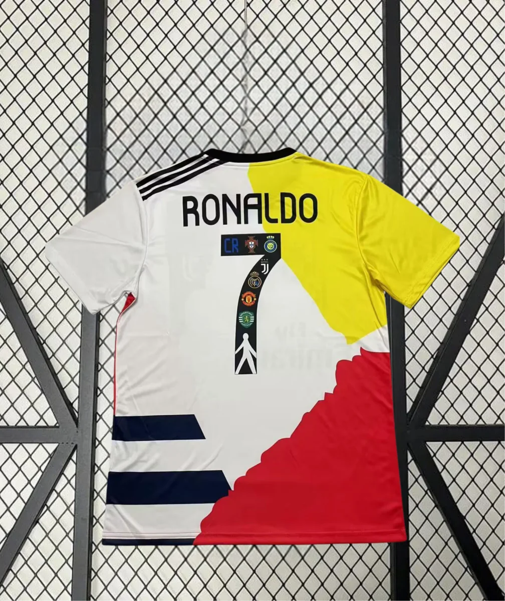 Ce maillot arbore un design exclusif intégrant les couleurs et les emblèmes des clubs où Ronaldo a marqué son empreinte :