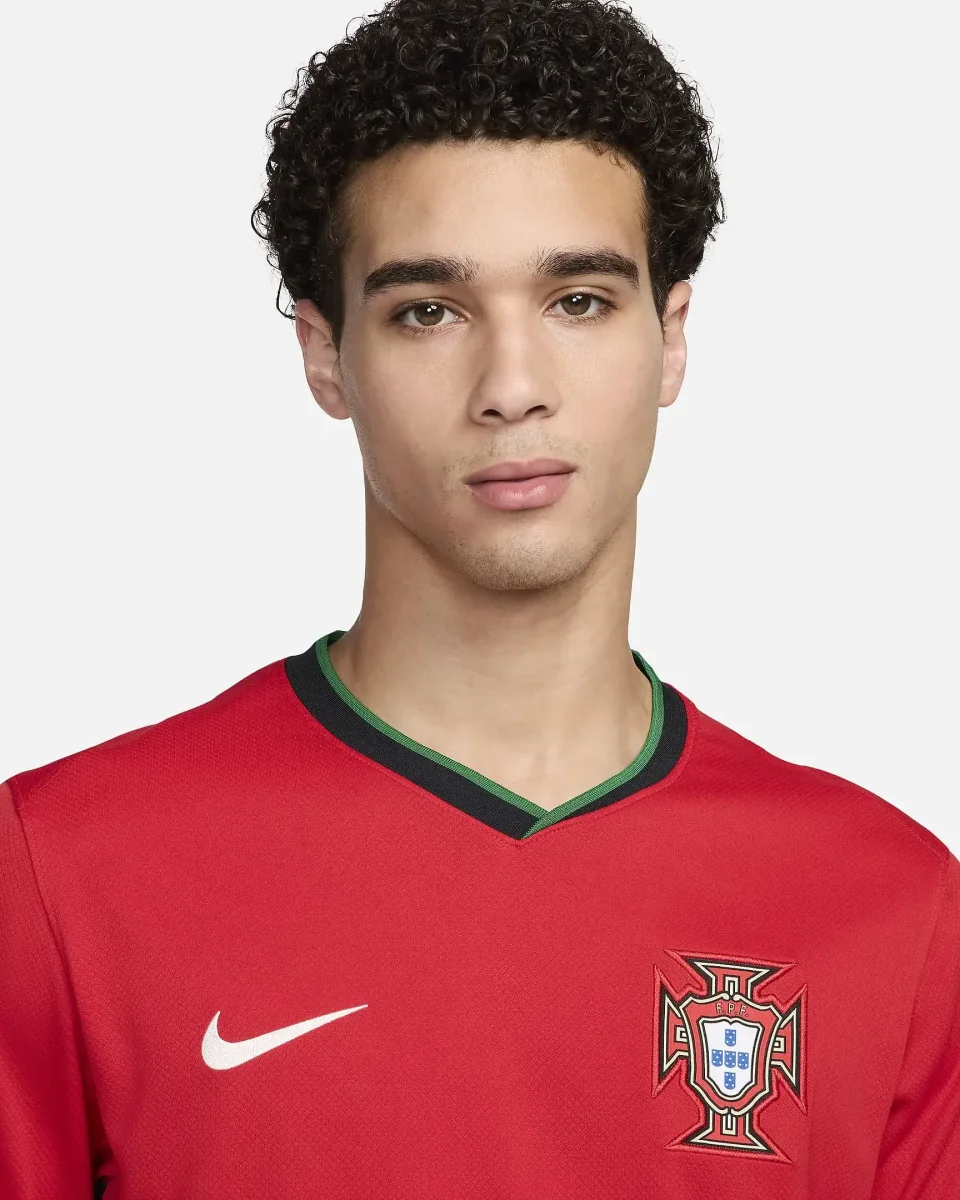 La tenue du Portugal Domicile 2024 Inspirée du drapeau national, combine le rouge passion avec des accents verts. L’écusson national est au cœur du maillot, symbolisant fièrement l’identité et l’héritage du football portugais.