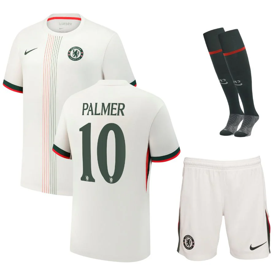 MAILLOT KIT ENFANT CHELSEA EXTERIEUR BLANC 2025/2026 Affichez fièrement votre soutien à votre équipe de football préférée pour la saison 2025-2026. Maillot + Short + Chaussettes Personnalisez votre maillot avec le nom et le numéro de vos joueurs favoris !