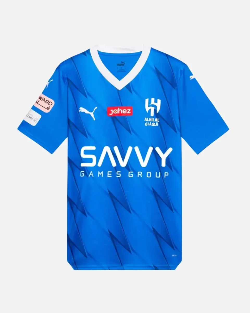 MAILLOT DOMICILE AL HILAL 2023/2024 – BLEU Le Maillot Al Hilal Domicile pour la saison 2023/24 est bien plus qu’une simple tenue, c’est une déclaration de la tradition et du triomphe qui caractérisent le club.