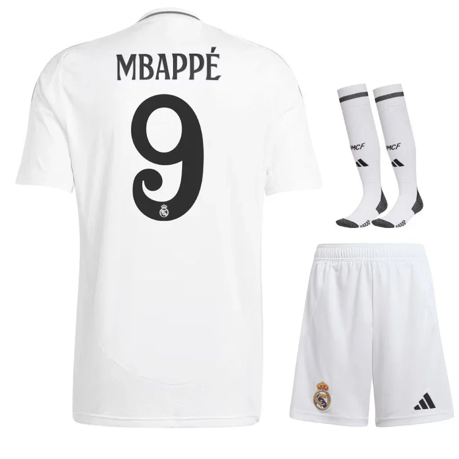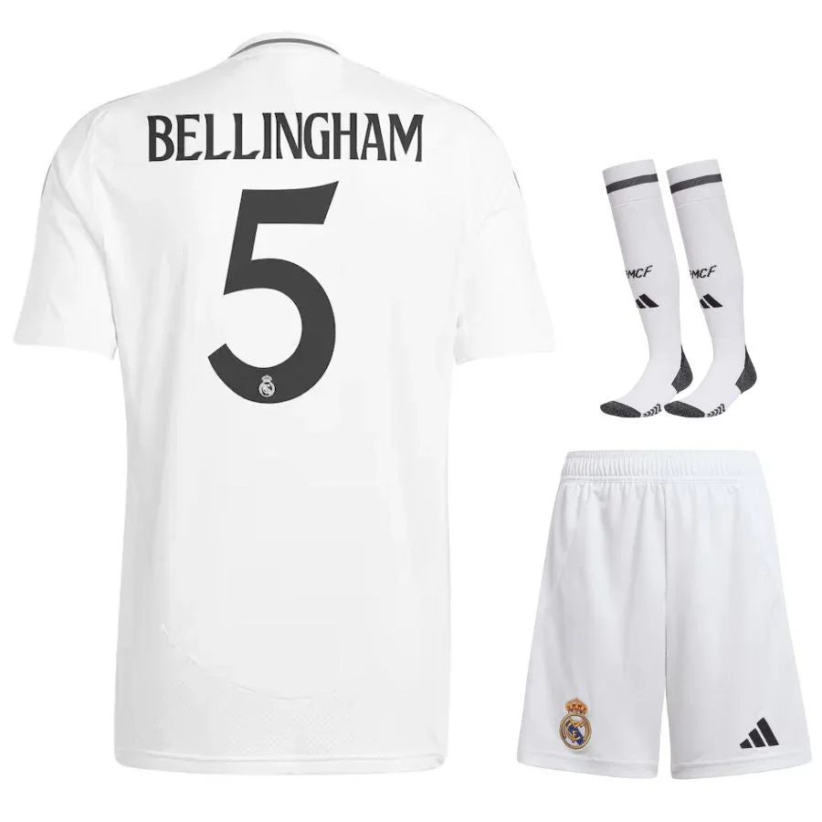 MAILLOT REAL MADRID KIT ENFANT DOMICILE 2024/2025 Maillot + Short + Chaussettes Supportez fièrement l’équipe de Football du Real Madrid pendant la saison 2024-2025. Flocage du nom et numéro de vos joueurs préférés