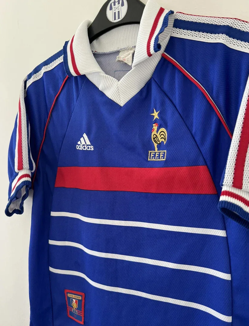 Maillot de foot retro iconique de l’Equipe de France porté lors de la Coupe du Monde 1998. Après une victoire 3-0 face au Brésil en finale, l’Equipe de France remportera sa première étoile face à son public au Stade de France un soir de 12 juillet 1998. Zinedine Zidane réalisera un match de grande classe en inscrivant les deux premiers buts, suivi ensuite d’Emmanuel Petit qui inscrira le but du 3-0 à la 93ème minutes.