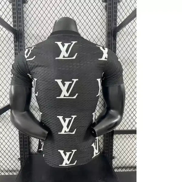Ce maillot arbore une base blanche éclatante, signature du Real Madrid, sublimée par des motifs monogramme LV dorés, apportant une touche de luxe et de modernité. Des accents noirs viennent souligner les finitions premium du design.